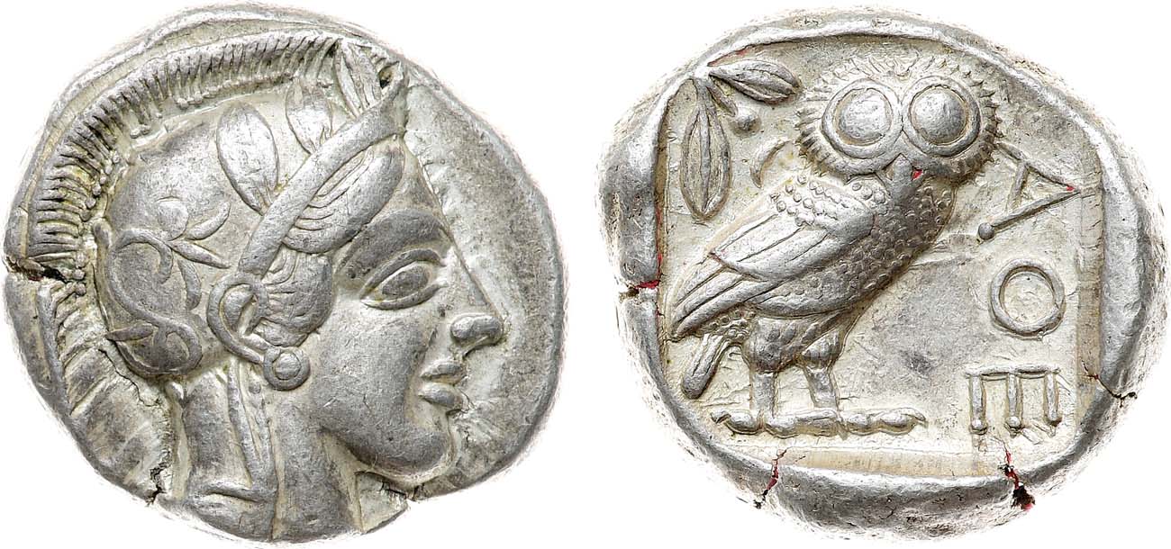 Серебро. 17,15г. Аверс: голова Афины "классического стиля" в аттическом шлеме вправо. Шлем украшен оливковыми листьями, в ухе богини серьга, на шее ожерелье. Реверс: "АʘЕ", сова стоит вправо, слева от нее оливковая ветвь и полумесяц. Полный гребень. Copenhagen 31. München 49.. UNC-.