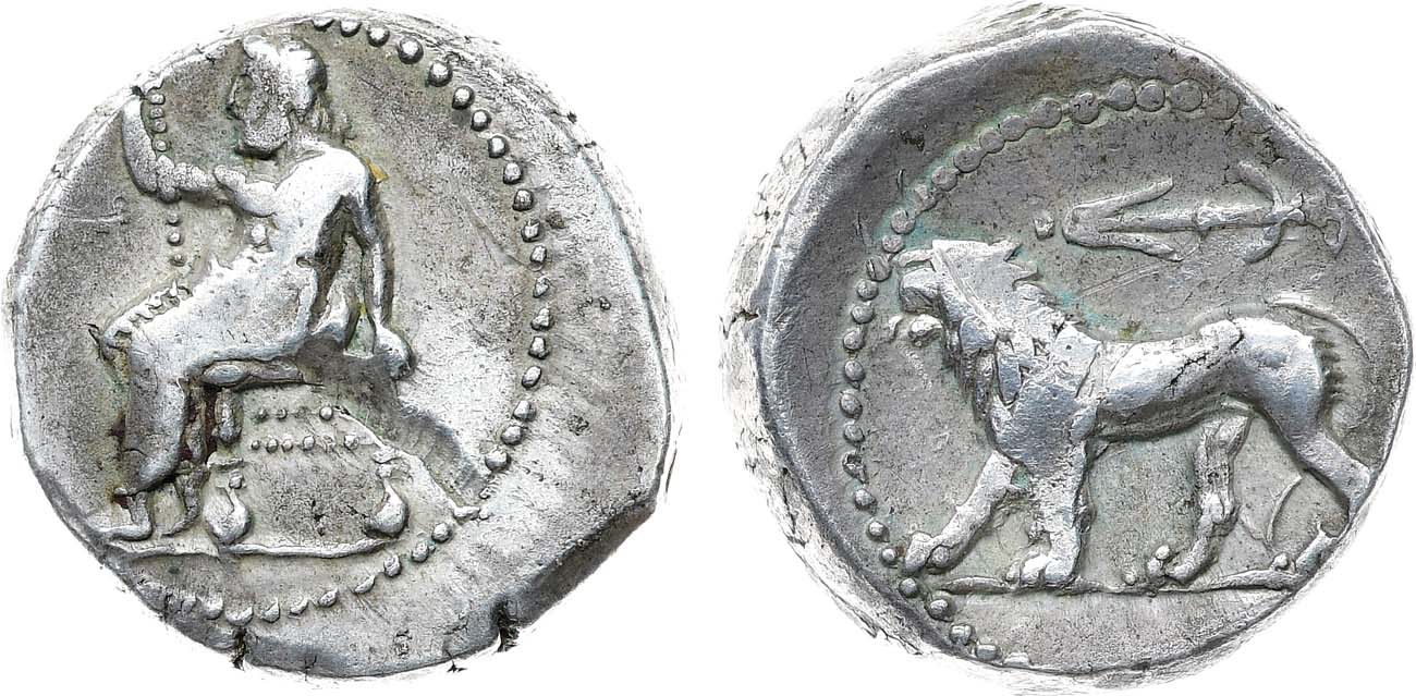 Серебро. 15,85г. Вавилон. Аверс: Баалтар со скипетром на троне влево. Реверс: лев, идущий влево, над ним якорь. VF.
