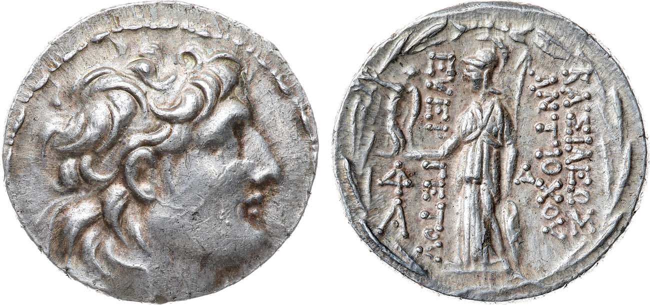 Серебро. 16,4г. Антиохия на Оронте. Аверс: голова Антиоха VII в диадеме вправо. Реверс: "ΒΑΣΙΛΕΩΣ / ΑΝΤΙΟΧΟY - EYEPΓETOY" Афина стоит вполоборота, повернув голову влево, на правой руке держит Нику, а левую кладет на щит, украшенный горгонейоном и стоящий на земле; копьем упирается в левую руку; слева вверху монограмма A; все в лавровом венке. HGC 9, 1067d. SC 2061.4j. XF.
