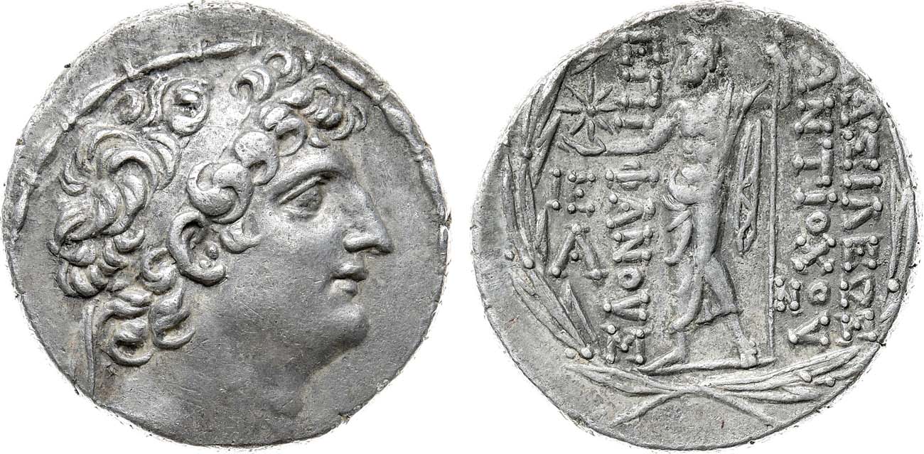 Серебро. 16,01г. Аверс: голова Антиоха VIII в диадеме вправо. Реверс: внутри лаврового венка Зевс стоит анфас держит в правой руке звезду, а в левой - длинный скипетр, выше него полумесяц; слева в поле "IE"; легенда "BAΣIΛEΩΣ / ANTIOXOY EΠIΦANOYΣ". XF/AU.