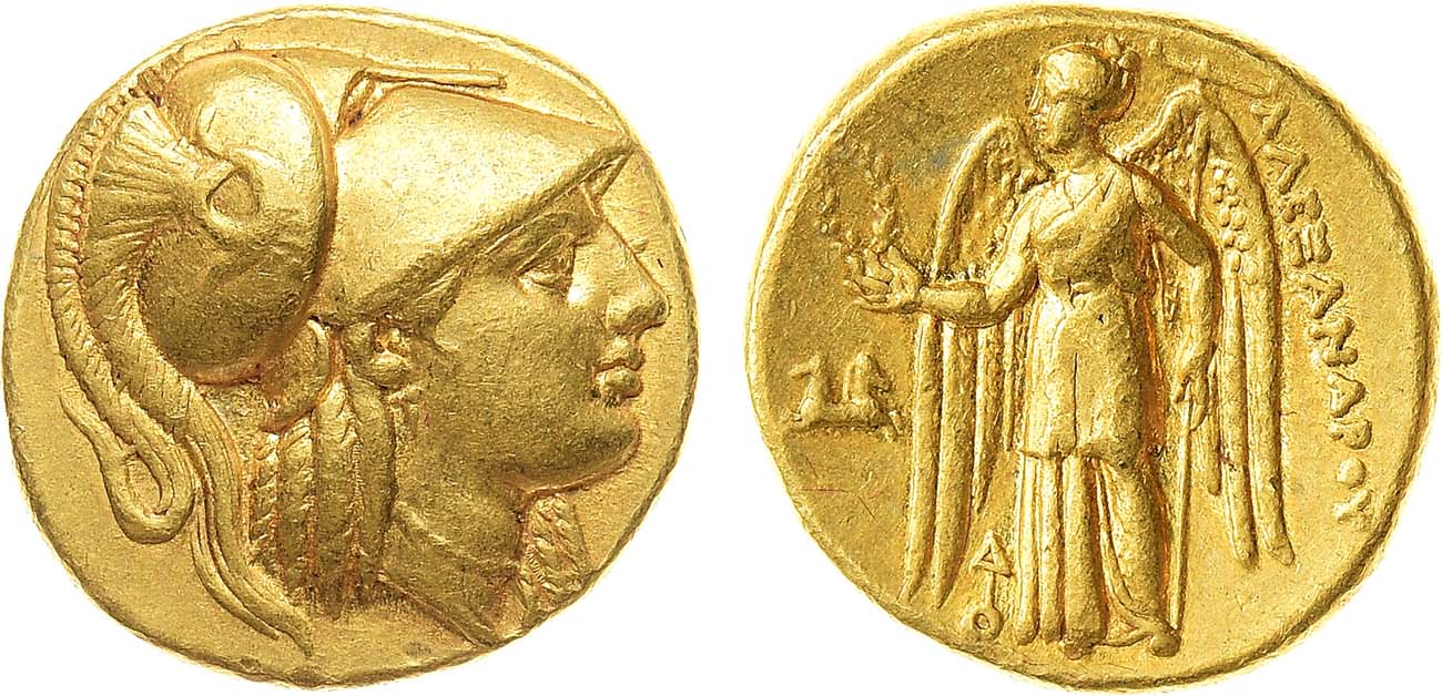 Золото. 8,52г. г. Лампсак. Аверс: изображение головы Афины в коринфском шлеме. Реверс: фигура Ники, идущая влево, с венком в правой руке, в левой – длинный скипетр. Справа от богини имя "ΑΛΕΞΑΝΔΡΟΥ"; слева в поле монограмма "лошадиные головы вправо и влево". UNC.