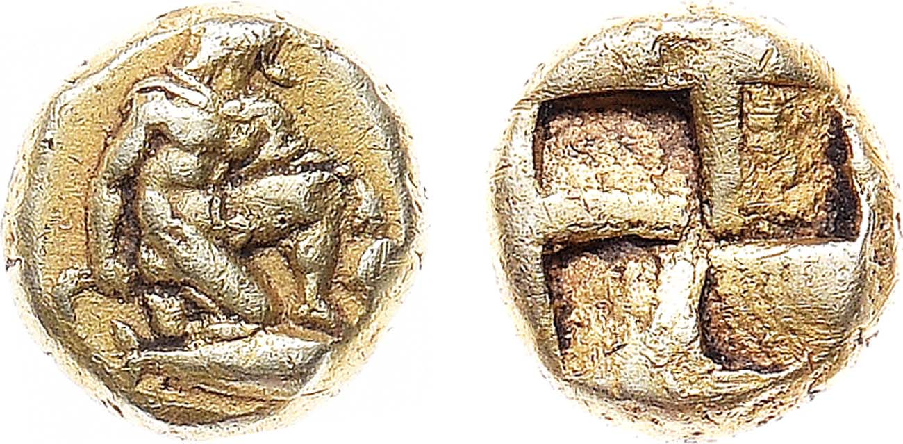 Электр. 1,25г. Аверс: изображение юноши вставшего на правое колено, вправо, внизу тунец. Реверс: вдавленный четырёхчастный квадрат. AU.