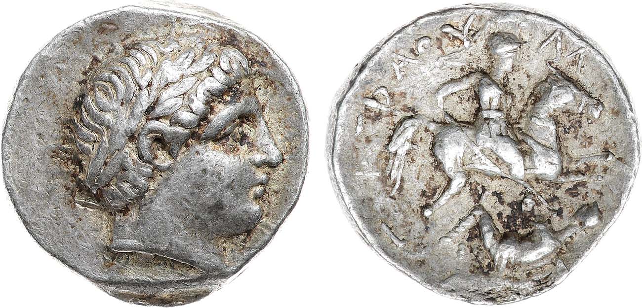 Серебро. 12,68г. Пеония (Северная Эллада). Аверс: изображение головы Апполона в лавровом венке вправо. Реверс: изображение всадника, поражающего копьём воина; легенда "ΠАТРАоҮ". XF.