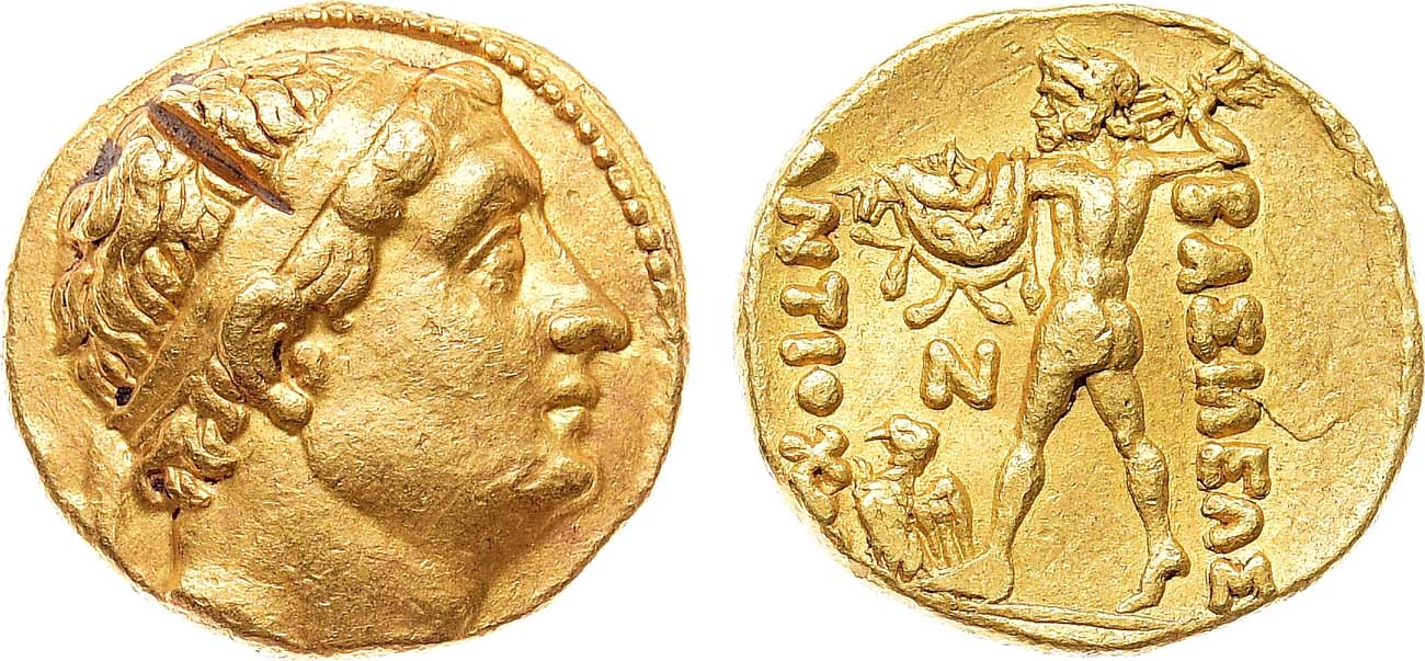 Золото. 8,29г. Балх. Аверс: голова Диодота I в диадеме вправо. Реверс: Зевс стоит влево и метает молнии, перед ним "N" и орел у ног. Mitchiner, Indogreek 63a. Hoover 19. UNC.
