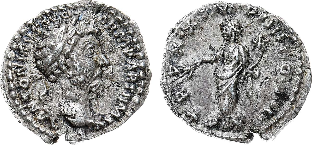 Серебро. 2,87г. Рим. Аверс: "M ANTONINVS AVG-ARM PARTH MAX" голова Марка Аврелия в лавровом венке вправо. Реверс: "TR P-XX IM-P IIII COS III PAX" Пакс стоит анфас, голова повёрнута влево, в правой руке лавровая ветвь, в левой рог изобилия. RIC 159. XF.