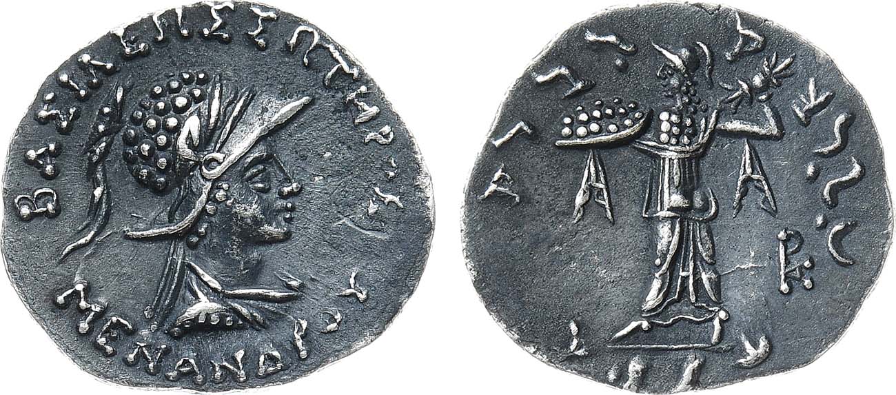 Серебро. 2,42г. Аверс: бюст в диадеме и драпировке, повёрнут вправо, в шлеме с гребнем, украшенном бычьим рогом и ухом; легенда "BAΣIΛEΩΣ ΣΩTHPOΣ MENANΔPOY". Реверс: Афина Алкидем метает молнию и держит щит; монограмма справа. XF/AU.