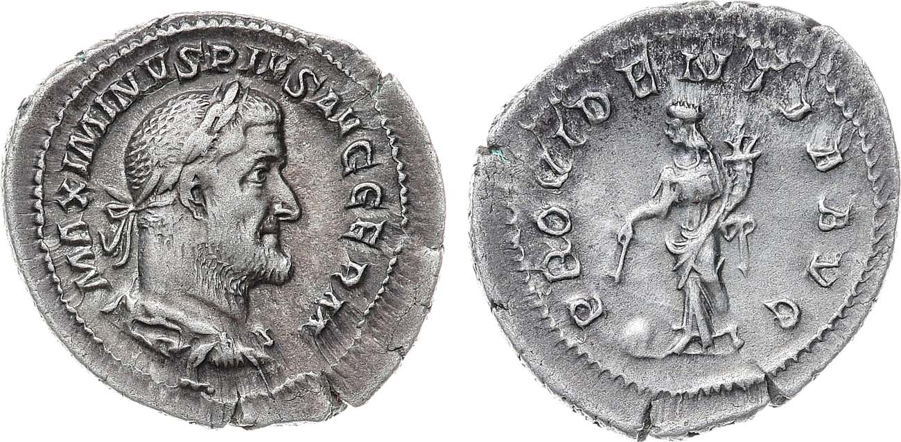Серебро. 2,73г. Рим. Аверс: "MAXIMINVS PIVS AVG GERM" драпированный бюст императора в кирасе и лавровом венке вправо. Реверс: "PROVIDENTIA AVG" Провиденция стоит лицом, повернув голову влево, в правой руке она держит жезл над земным шаром, а в левой — рога изобилия. BMC 171. Cohen 75. RIC 20. XF/AU.