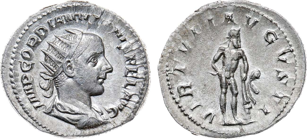 Серебро. 4,66г. Рим. Аверс: бюст Гордиана в короне вправо; легенда "IMP GORDIANVS PIVS FEL AVG". Реверс: Геркулес в лавровом венке стоит справа, держа правую руку за спиной и опираясь левой на палицу; легенда "VIRTVTI AVGVSTI". RIC 95. AU/UNC.