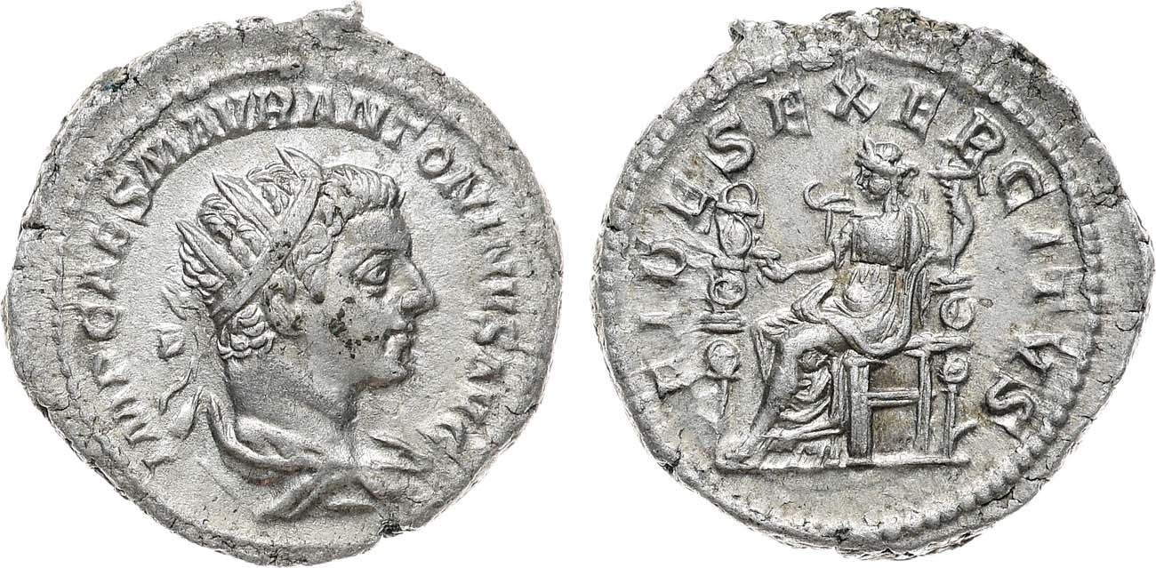 Серебро. 5,22г. Рим. Аверс: "IMP CAES M AVR ANTONINVS AVG " бюст императора в лучистой короне вправо. Реверс: "FIDES EXERCITVS" Фидес влево на троне. Sear 7469. AU.