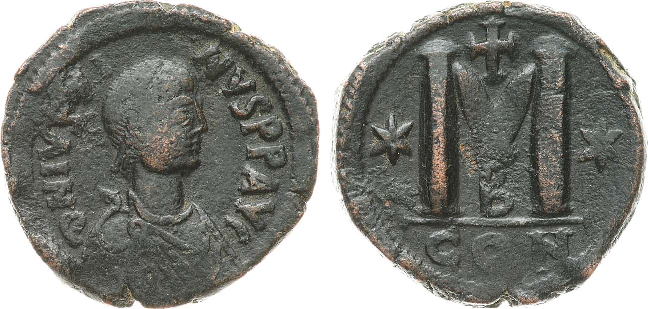 Медь. 17,85г. Константинополь. Аверс: бюст императора в диадеме вправо; легенда "D N IVSTINVS P P AVG". Реверс: большая буква "М" между звёздами; внизу "CON". VF.