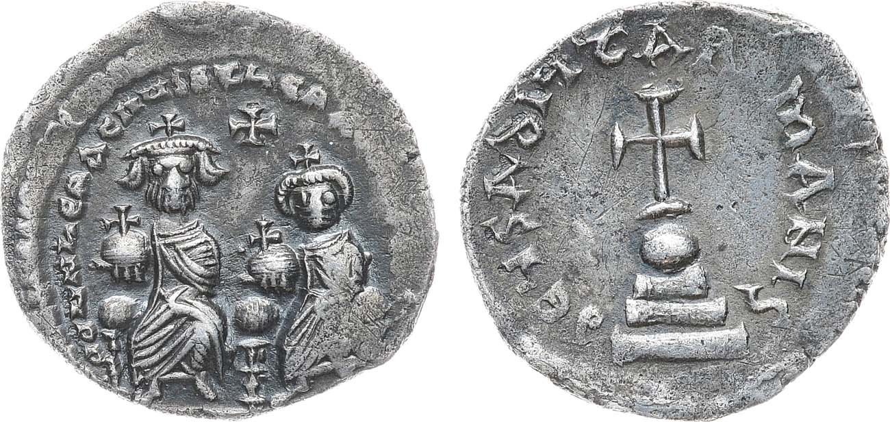 Серебро. 6,53г. Константинополь. Аверс: Ираклий и Ираклий Константин сидят лицом друг к другу на двойном троне, оба держат державы, над ними крест; легенда "d d N N hЄRACLIЧS ЄT hЄRA CONsT". Реверс: большой крест на сфере, установленной над тремя ступенями; легенда "dЄЧS AdIЧTA ROMANIS". XF/AU.