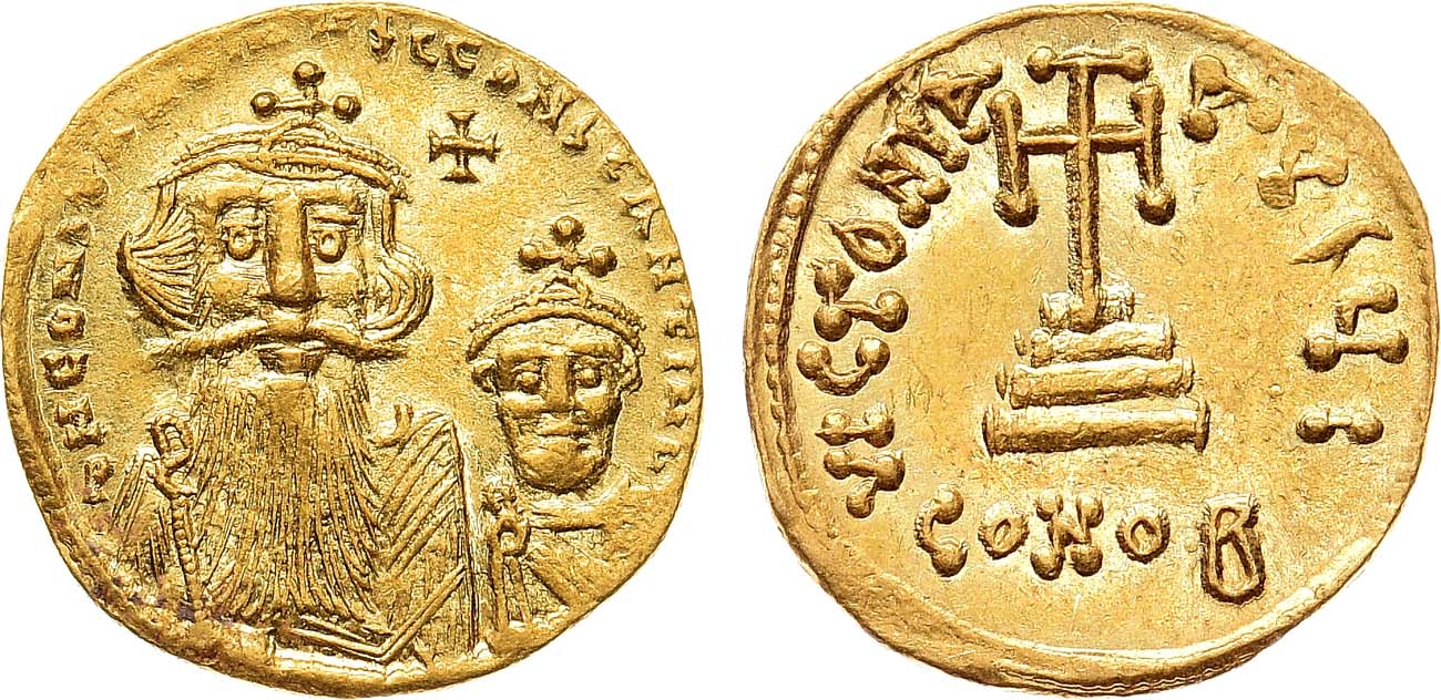 Золото. 4,41г. Константинополь. Аверс: круговая легенда "DN CONSTAN-TINЧS C CONSTANI", портреты императоров Константа II и Константина IV в коронах с крестами; между ними на поле маленький крест. Фигуры в церковных облачениях, кресты на коронах и крест на поле между ними. Реверс: круговая легенда "VICTORIA-AVГЧI", Крест на трёх ступенях, внизу - "CONOB". Sear 959. Sommer 12.18.1. AU/UNC.