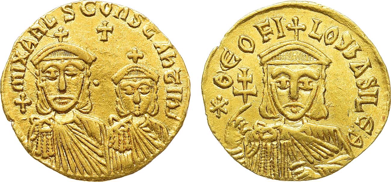 Золото. 4,43г. Константинополь. Аверс: портрет императора Феофила анфас с короткой бородой, в короне с крестом, с крестом и акакией в руках; круговая легенда "*ѲЄOFI LOS bASILЄѲ". Реверс: изображения императора Михаила II и Константина; круговая легенда "+MIXAHL S COhSTAhTIh' ". Sear 1653. Sommer 31.2. AU.