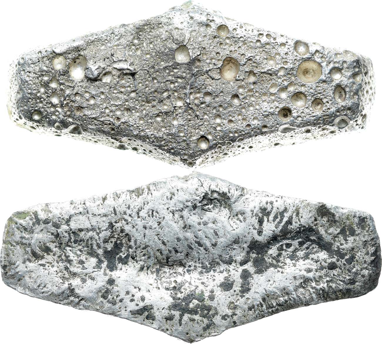 Характерная небольшая высота и продолговатость слитка, формы усадочных пор и стандартная масса позволяют предположить изготовление данного слитка в начальный период их использования. Привлекательный коллекционный экземпляр. Очень редка.