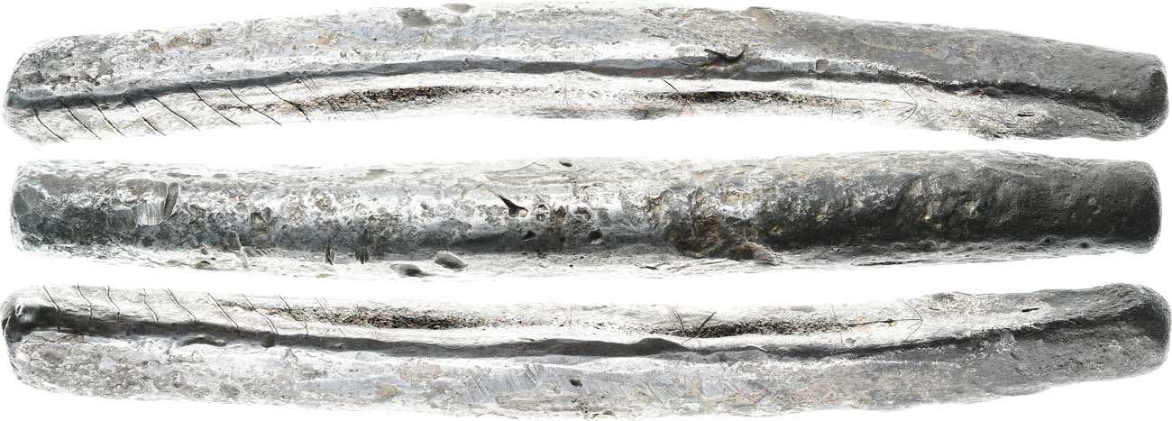 Серебро. 194,34г. Длина: 142,5 мм. Ширина: 14,5 мм, 15,34 мм (центр). Высота: 12 мм. Сверху слитка имеется характерная усадочная ложбинка. Граффити на основании слитка. Отсутствие на боковой поверхности шва свидетельствует об отливке в один прием. Прокопов 26. AU.