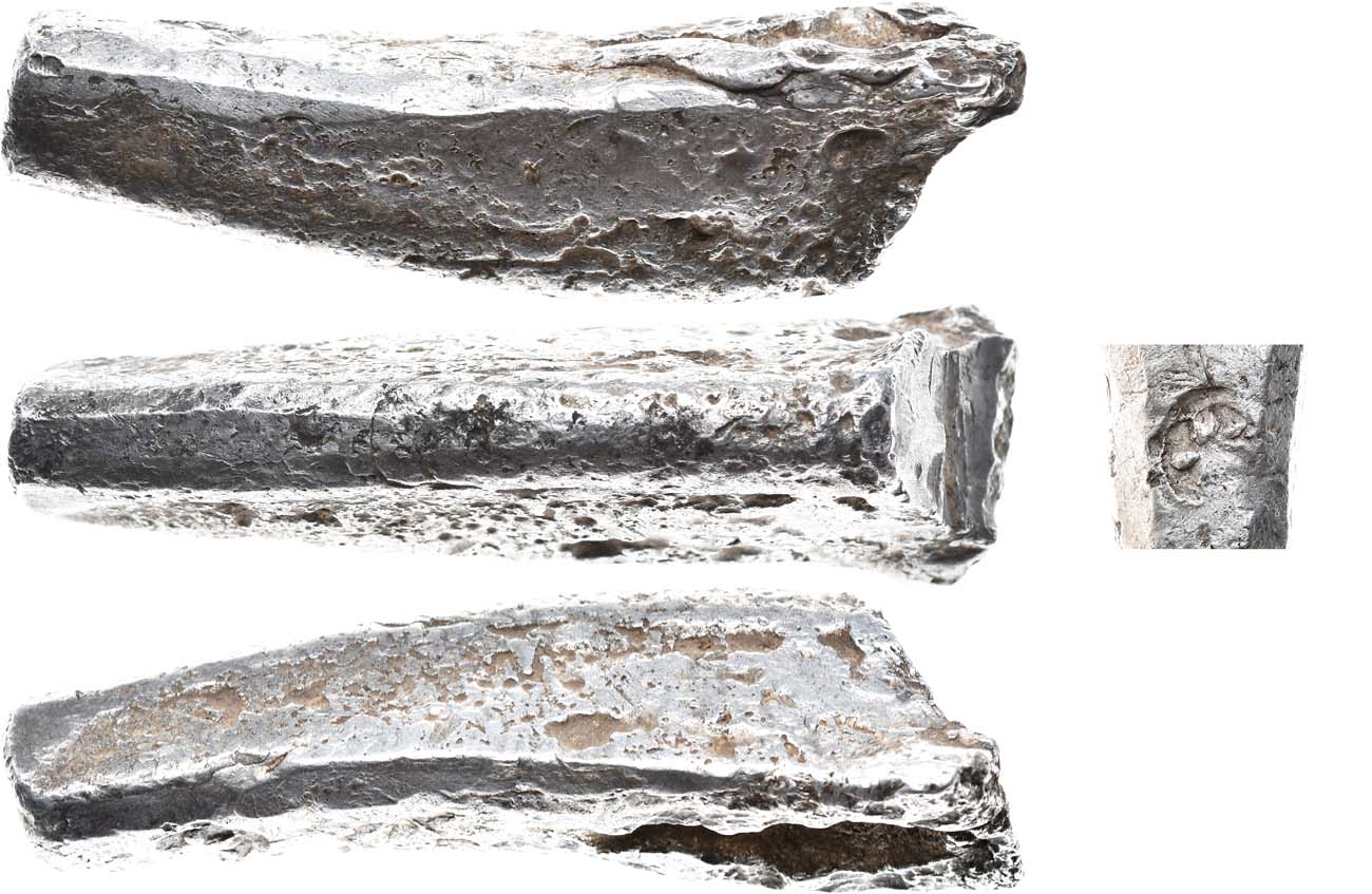 Серебро. 95,77г. Длина 65,28 мм. Ширина 19,11 мм (сруб, середина); 10,55 мм (край). Высота 18,57 мм. Следы проковки. На верхней плоскости слитка виден фрагмент клейма в виде цветка (Прокопов - Л2 с.95). Изготовлена в последней трети XIV века на территории Ливонии. AU.