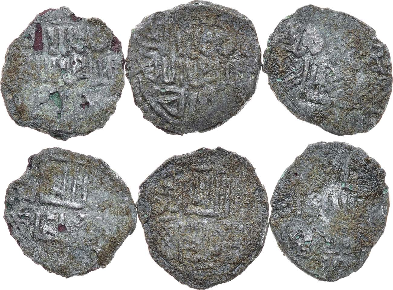 Медь, серебрение. 1. Диаметр: 19 мм. Вес: 1,39 г. Двустороннее подражание арабской вязи. 2. Диаметр: 19 мм. Вес: 1,03 г. Двустороннее подражание арабской вязи. 3. Диаметр: 18 мм. Вес: 1,2 г. Двустороннее подражание арабской вязи. XF.