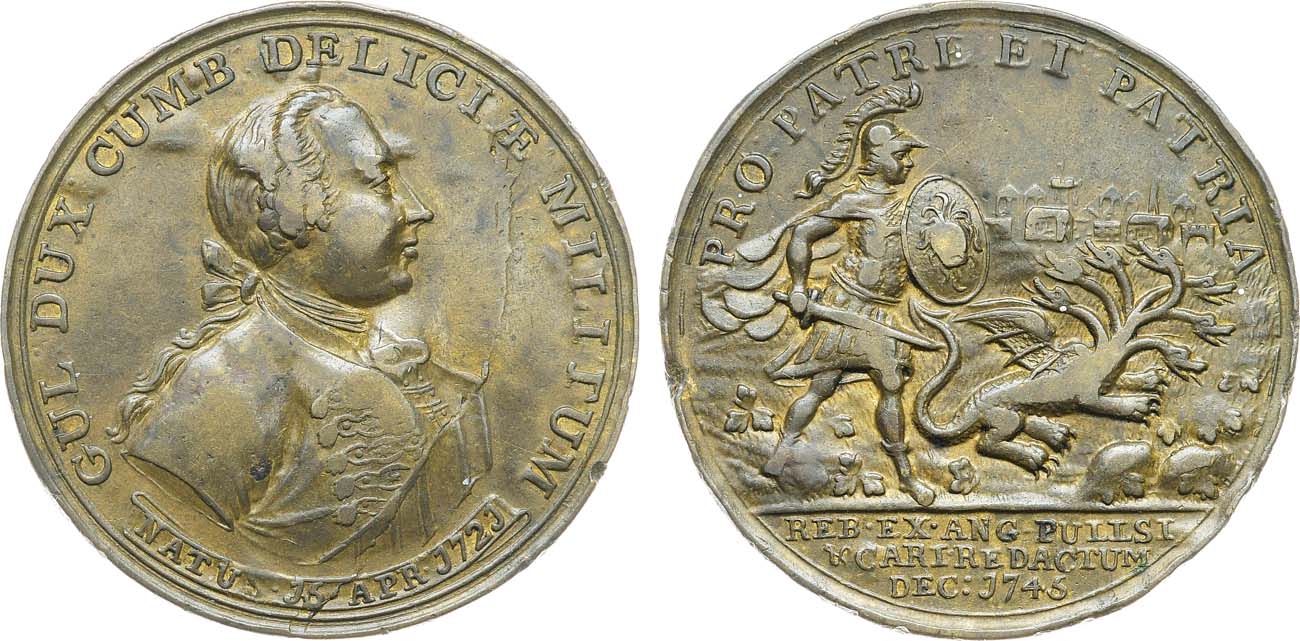 Бронза. 11,27г. Диаметр 35 мм. Дания, Копенгаген. Неизвестная мастерская. Медальер И.Г. Вольф (без подписи). Аверс: герцог Кумберленд. Реверс: герцог (воин) атакует Якобитскую гидру. XF.