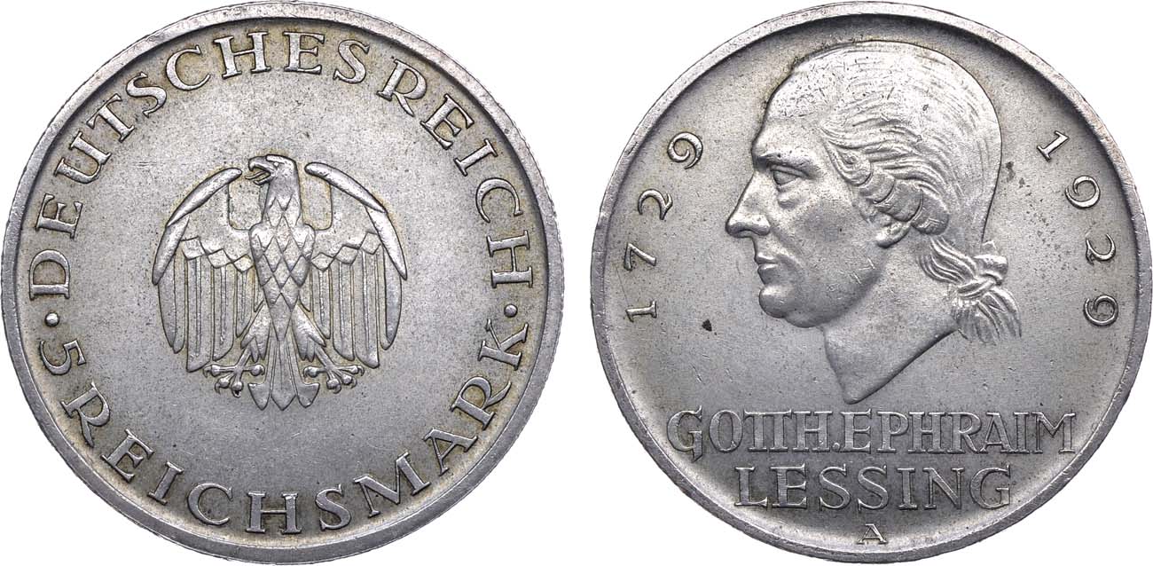 Серебро. 25г. Берлин (А). Отчеканена в память 200-летия со дня рождения Готхольда Лессинга. KM 61. Jaeger 336. Weege 37. AU/UNC.