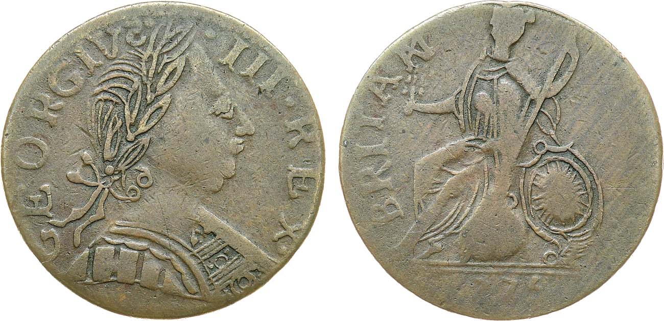 Медь. 6,78г. Машинная имитация 1/2 пенни Великобритании с изображением Георга III. Anton, Kesse #9. VF.
