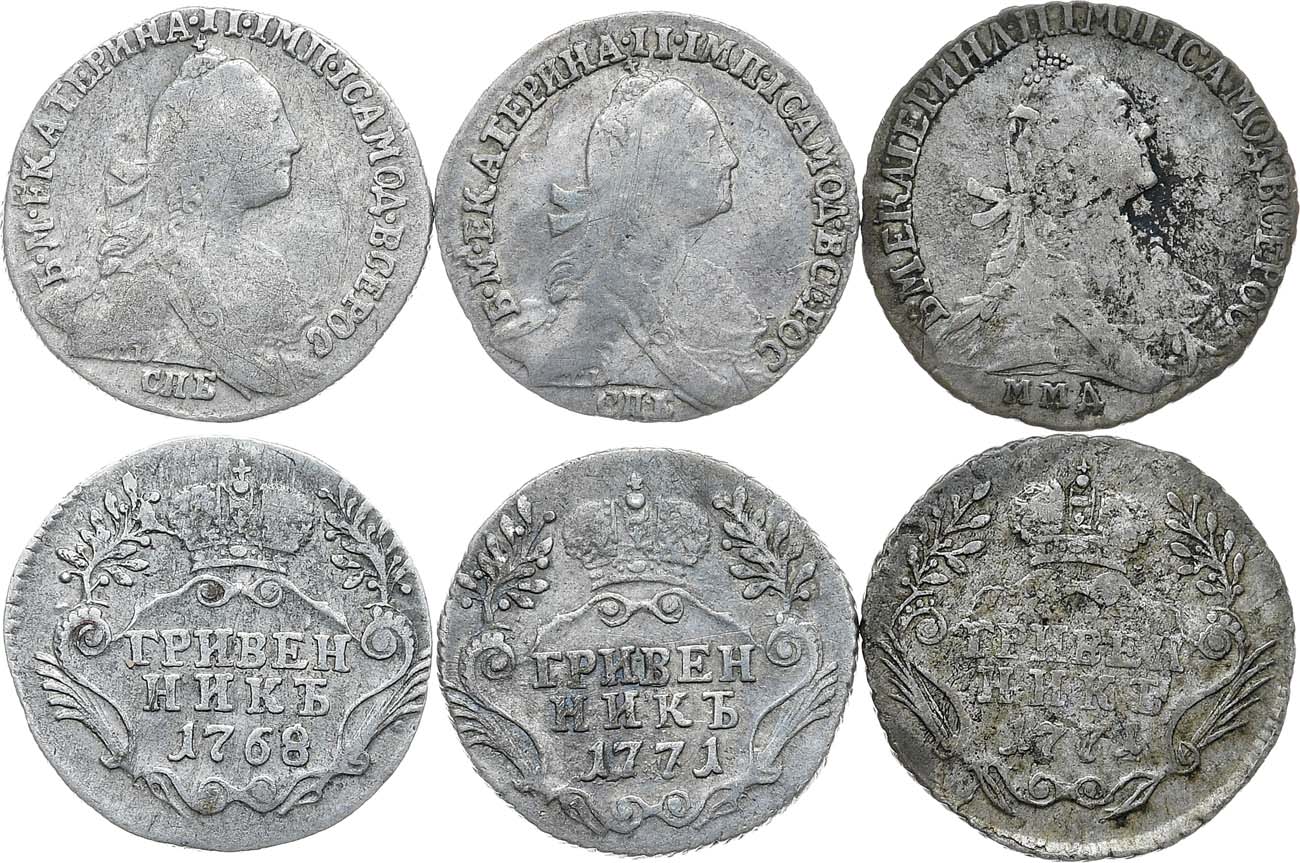 Серебро. Гривенник 1768 года. СПБ. Серебро. 2,11 г. Гривенник 1771 года. ММД. Серебро. 2,06 г. Гривенник 1771 года. СПБ. Серебро. 2,2 г. VF.