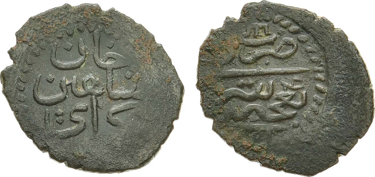 Медь. 1,5г. Бахчисарайский монетный двор. Аверс: год персидской цифрой. Сариев 283(R). XF/AU.