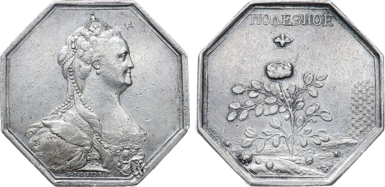Серебро. 13,68г. Размеры: 36х33,5 мм. Санкт-Петербургский монетный двор. Аверс: медальер Т.И. Иванов (под портретом "В•Т•I•1793•Г•" - "Вырезал Т. Иванов в 1793 году"). Реверс: медальер С. Юдин (справа внизу "Ю"). Смирнов 325/б. Дьяков 234.2(R1). AU.