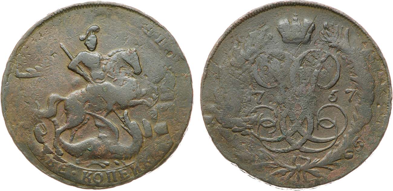 Медь. 18,54г. Красный монетный двор. Без обозначения монетного двора. Гурт сетчатый. Перечекан из копейки 1755 года. Уздеников 2574. Биткин 391. Дьяков 121, 468. Brekke 92, 91. F.