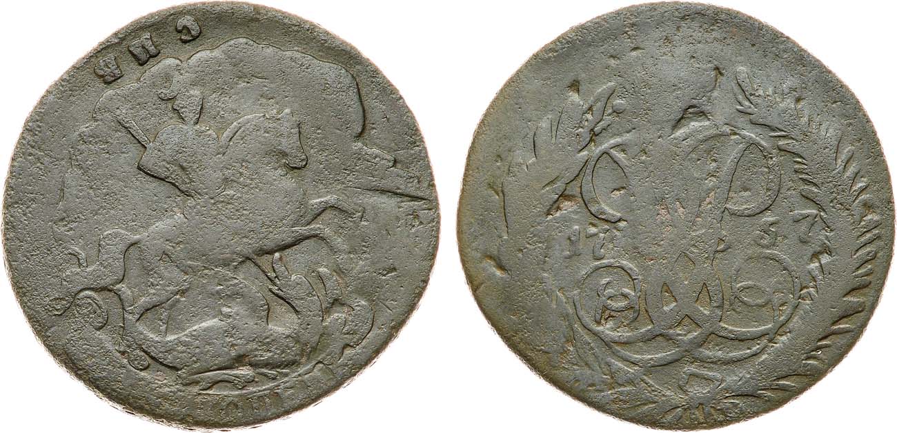 Медь. 18,51г. Красный монетный двор. Без обозначения монетного двора. Гурт сетчатый. Перечекан из копейки 1755 года. Уздеников 2574. Биткин 391. Дьяков 121, 468. Brekke 92, 91. F.