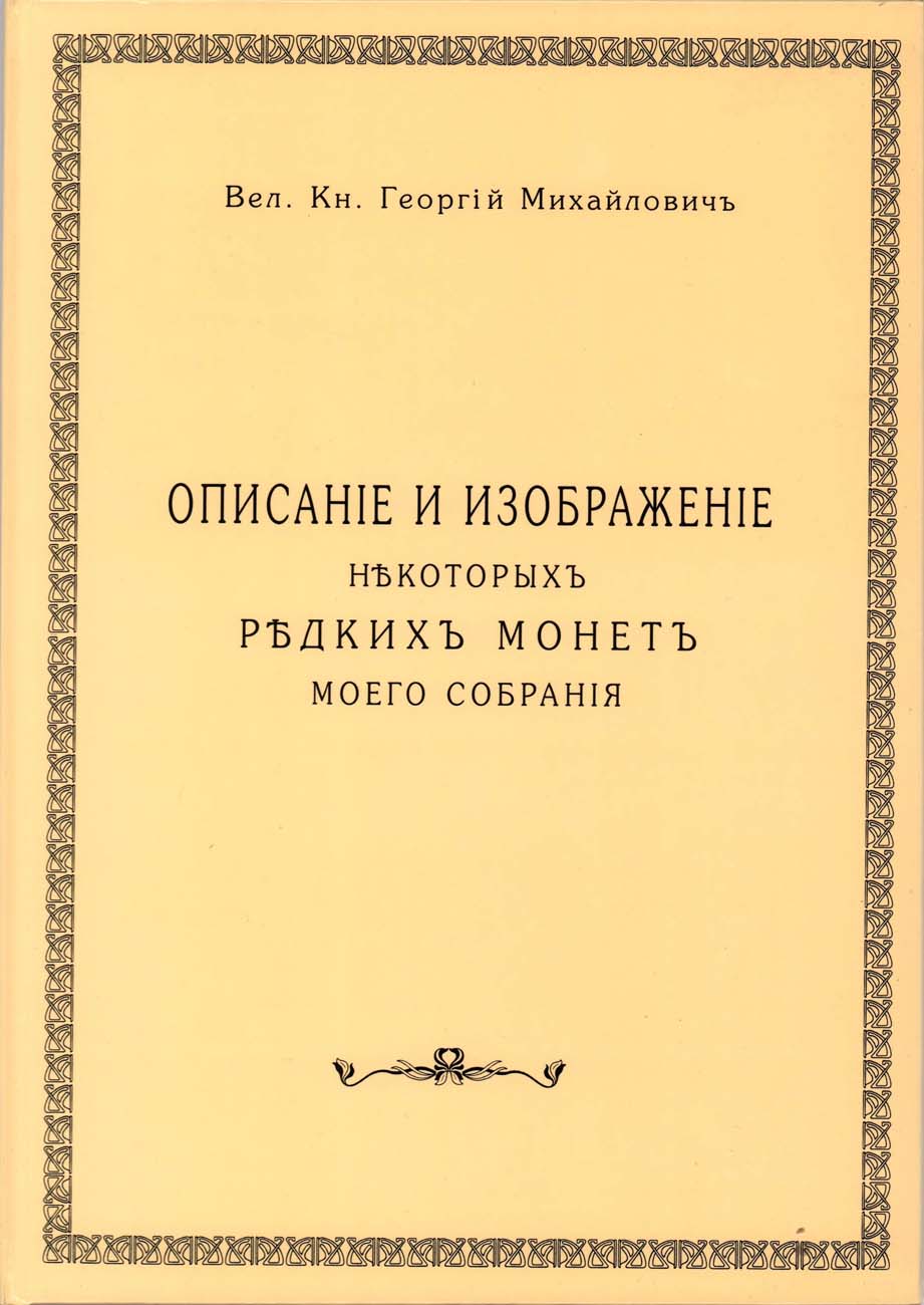 СПБ, 1886 г. V37 стр.+7 таблиц илл. Репринт М.Е. Дьякова 2002 года. Эта книга предваряет собой издание "Корпуса русских монет" и содержит описание и изображения самых редких и не опубликованных на то время монет из коллекции Великого Князя Георгия Михайловича. Подробно описаны и изображены такие шедевры русской нумизматики, как пробный рубль 1710 года, 20 рублей 1755 года, 1 рубль 1762 года с портретом императрицы Екатерины II, отчеканенный в золоте, "Константиновский" рубль 1825 года, а также множество других пробных и крайне редких монет.