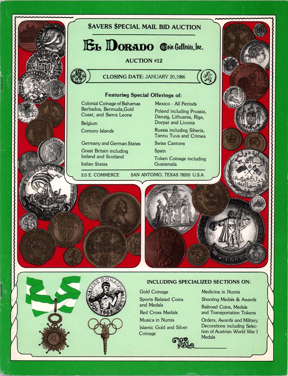 Сан-Антонио, 20 января 1986 года. 2456 лотов. Русская часть (117 лотов) включает интересные монеты, а также подборку медных медалей XIX века, Стоит выделить 10 рублей 1762 года ММД с портретом Екатерины II в необыкновенно высокой коллекционной сохранности.