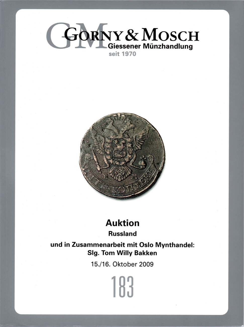 Мюнхен, 15-16 октября 2009 года. 97 стр. 1706 лотов. Более 700 лотов русских медных монет и медалей из известнейшей коллекции норвежского нумизмата Тома Вилли Баккена, "ученика" другого норвежца Бернарда Брекке, в сотрудничестве с которым и было написано дополнение к каталогу медных монет Брекке 1977 года.