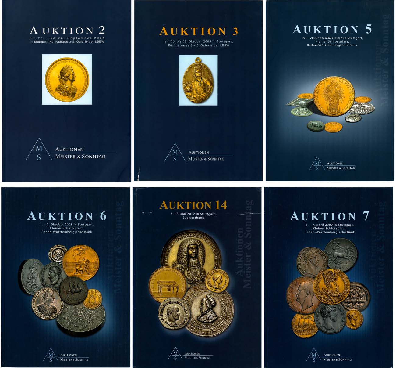 Штутгарт, 2004-2012 гг. Аукцион 2. 21-22 сентября 2004 года. 2400 лотов. 153 русских. Представлены золотые медали из коллекции Вел. Кн. Георгия Михайловича (ранее продаваемые на аукционах Hess и Chrisie's) . Потрясающая подборка! Аукцион 3. 6-8 октября 2005 года. 3727 лотов. 276 русских. Интересны золотая медаль 1682 в память вступления Петра I на престол, золотая медаль 1708 в память битвы при Лесной. золотая медаль 1709 в память Полтавской битвы и ее новодел, золотая медаль 1839 на открытие обсерватории в Пулкове и другие. Аукцион 5. 19-20 сентября 2007 года. 2500 лотов. 180 русских. Интересен червонец 1703 года. Аукцион 6. 1-2 октября 2008 года. 2659 лотов. 206 русских. Интересен новодел рубля 1723 в золоте, золотая медаль 1787 года в память путешествия Екатерины II в Крым. Аукцион 7. 6-7 апреля 2009 года. 1578 лотов. 43 русских. Аукцион 14. 7-8 мая 2012 года. 1456 лотов. 45 русских (почти все - медали). Интересна золотая медаль "Достойному" с портретом Екатерины II.
