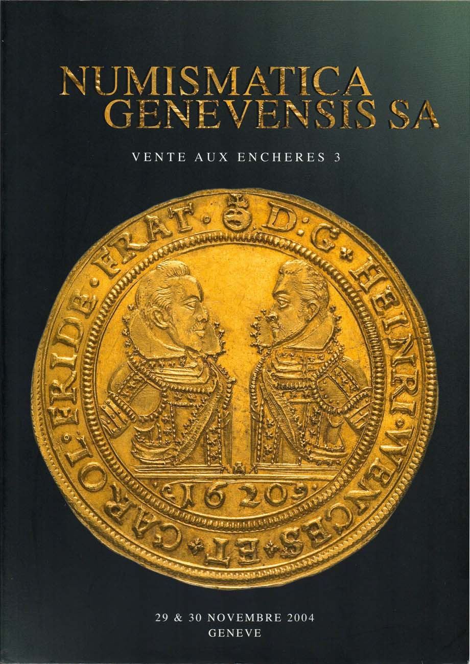 Женева, 29-30 ноября 2004 года. 1330 лотов. Много античных монет в высокой сохранности и редких монет и медалей Европы XVII-XIX вв. Русская часть представлена 218 лотами. Среди топ-лотов: двойной червонец 1714, 1749, 1751, червонцы 1701, 1703, 1712, 1713, 1714, 1716, 1729, 1738, 1796 гг, империал и полуимпериал 1895, золотая медаль 1855 на смерть Николая I, большие золотые коронационные медали 1856, 1883 гг.