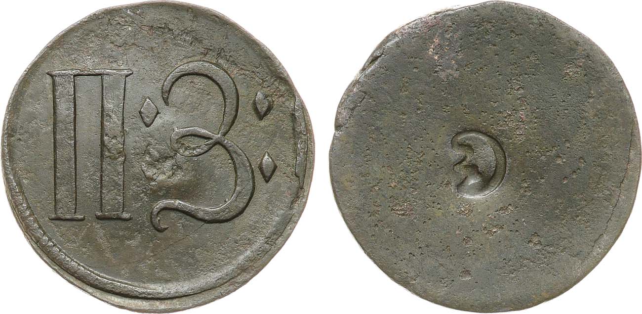 Медь. 6,83г. Диаметр 25 мм. Аверс: литеры "П•З:". Реверс: фигурная надчеканка. Григорьев, Черноухов 0529 (÷). AU.