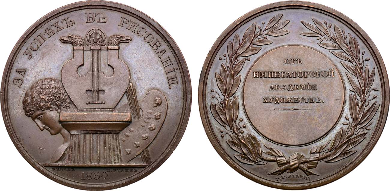 Бронза. 58,53г. Диаметр 51 мм. Санкт-Петербургский монетный двор. Медальер П.П. Уткин (аверс — под обрезом изображения слева: "РЕЗАЛЪ", справа: "УТКИНЪ."; реверс — внизу: "Р.П.УТКИНЪ"). Дьяков 492.3(R0). AU 58.