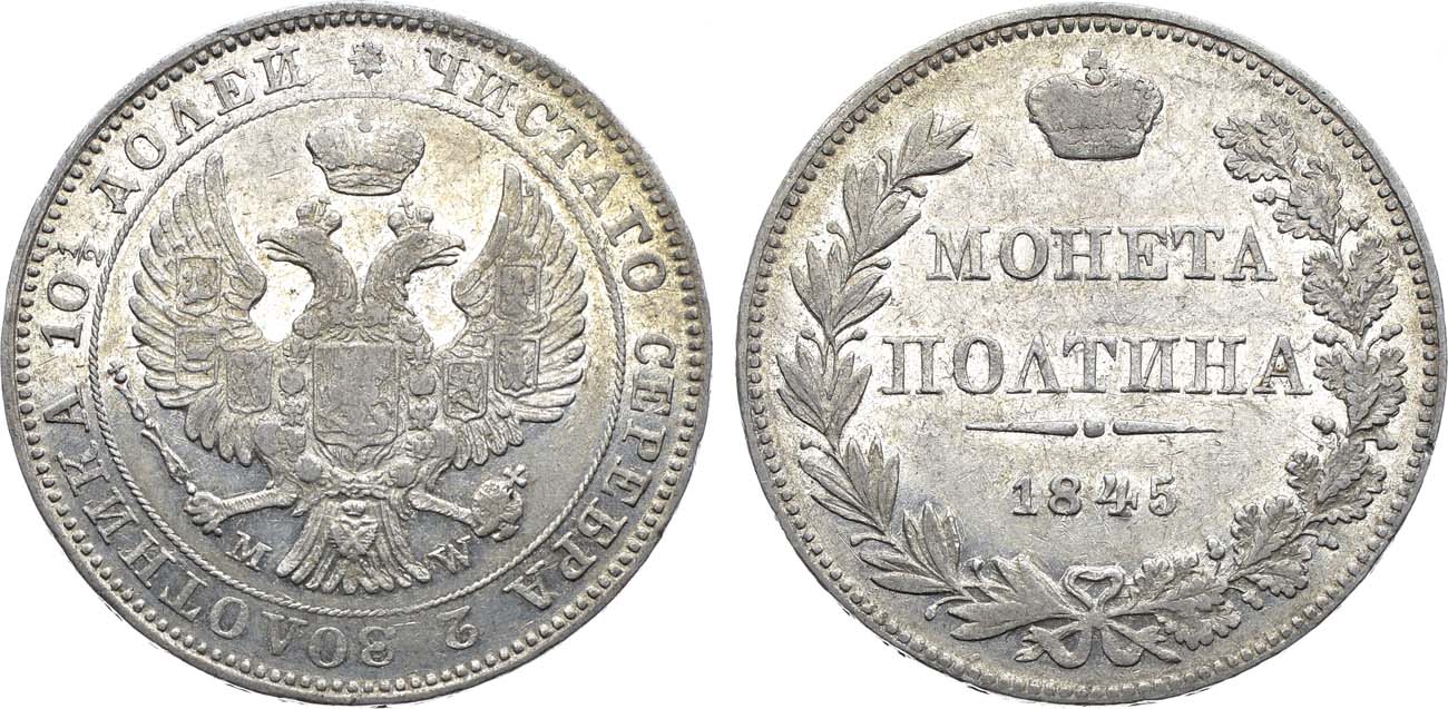 Полтины 1845 года, отчеканенные на Варшавском монетном дворе, встречаются очень редко.