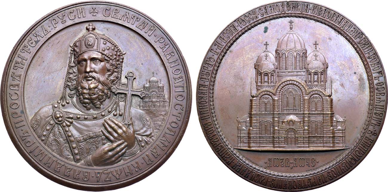Бронза. 151,5г. Диаметр 68 мм. Санкт-Петербургский монетный двор. Медальеры: аверс: В.В.Никонов по проекту А.В.Прахова (в нижней части изображения князя Владимира, слева: "СОЧ. ПРОФ. А.ПРАХОВЪ.", справа, под изображением храма: "В.НИКОНОВЪ.Р."); реверс: М.А.Скуднов по проекту А.В.Прахова (внизу у венка, слева: "РѢЗ.М.СКУДНОВЪ.", справа: "СОЧ. И ВЫЛѢП.ПРОФ.А.ПРАХОВЪ."). Смирнов 1115. Дьяков 1170.1(R1). AU/UNC.