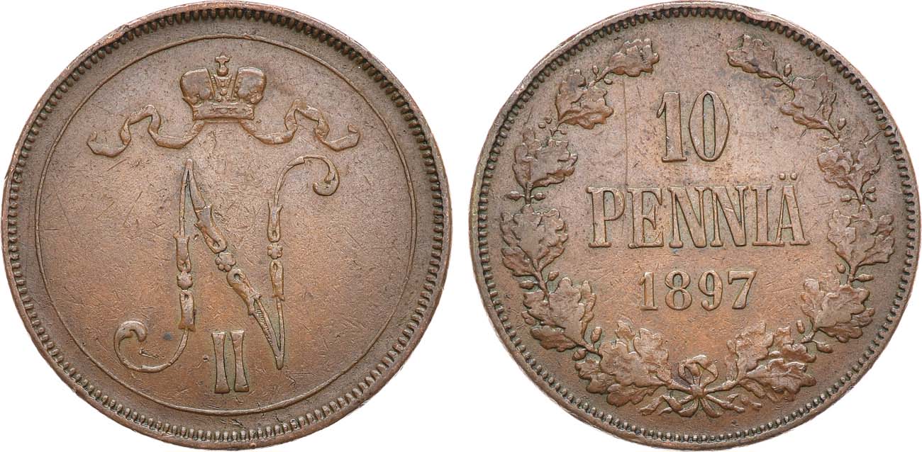 Медь. 12,71г. Для Финляндии. Гельсингфорсский монетный двор. Тираж: 502948 экз. Уздеников 4753. Биткин 425. Казаков 105. XF.