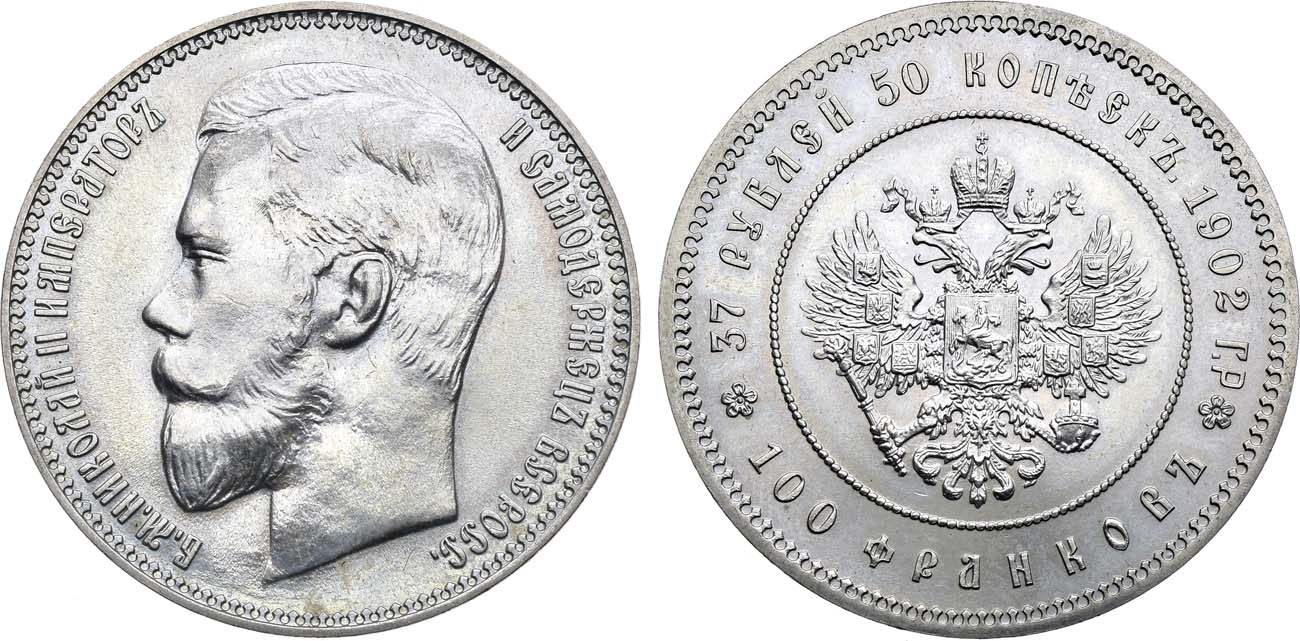 В 1990 году на Ленинградском монетном дворе в медно-никелевом исполнении, тиражом 50 000 штук были изготовлены реплики монеты 37 рублей 50 копеек - 100 франков. М.И. Смирнов писал о них: «… к новоделам, впрочем, с некоторой натяжкой, можно отнести изготовленные в 1990 году в медно-никелевом сплаве монеты с двойным обозначением номинала: „37 рублей 50 копеек - 100 франков“ 1902 года, отнесенные нумизматами к разряду донативных … Для обозначения их „новодельности“ на оборотной стороне проставлена литера „Р“, в данном случае расшифровываемая, как реплика или повторение».