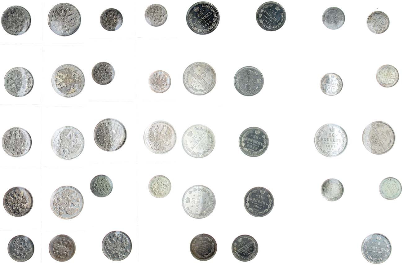 Серебро. 20 копеек 1884 СПБ-АГ, 20 копеек 1893 СПБ-АГ, 20 копеек 1909 СПБ-ЭБ, 20 копеек 1913 СПБ-ВС, 20 копеек 1914 СПБ-ВС, 20 копеек 1915 СПБ-ВС, 15 копеек 1906 СПБ-ЭБ, 15 копеек 1913 СПБ-ВС, 15 копеек 1915 ВС 2 экз., 15 копеек 1916 ВС, 10 копеек 1907 СПБ-ЭБ, 10 копеек 1913 СПБ-ВС, 5 копеек 1888 СПБ-АГ, 5 копеек 1890 СПБ-АГ, 5 копеек 1908 СПБ-ЭБ, 5 копеек 1912 СПБ-ЭБ, 5 копеек 1913 СПБ-ВС, 5 копеек 1914 СПБ-ВС. AU-UNC.