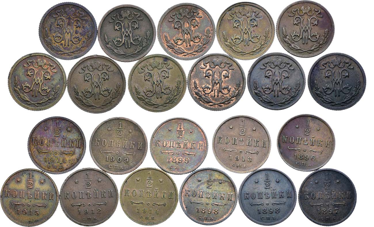 Медь. В состав лота входят: 1/2 копейки 1896, 1897, 1898 (2шт,), 1899, 1909, 1912, 1913, 1914 (2шт.), 1915 гг. XF-AU/UNC.