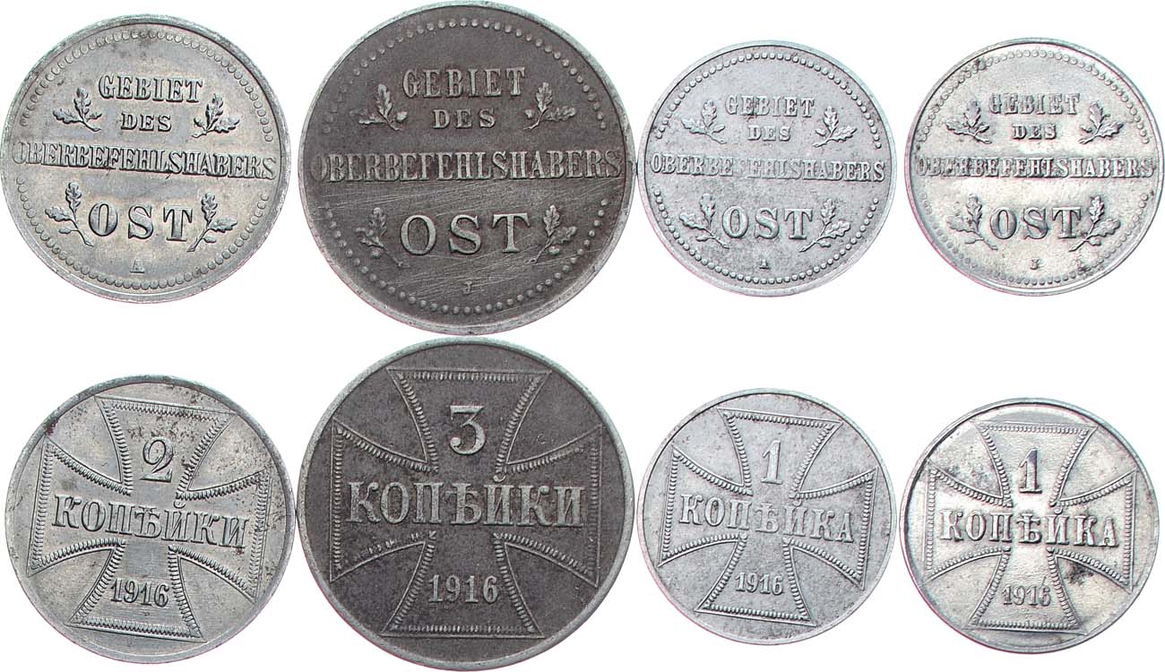 Железо. Для областей России, оккупированных немецкими войсками в период Первой Мировой войны. 3 копейки 1916 года. Берлин (А). Уздеников 4944. Биткин 1. 2 копейки 1916 года. Берлин (А). Уздеников 4947. Биткин 4. 1 копейка 1916 года. Гамбург (J). Уздеников 4949. Биткин 7. 1 копейка 1916 года. Берлин (А). Уздеников 4948. Биткин 6. VF-UNC.