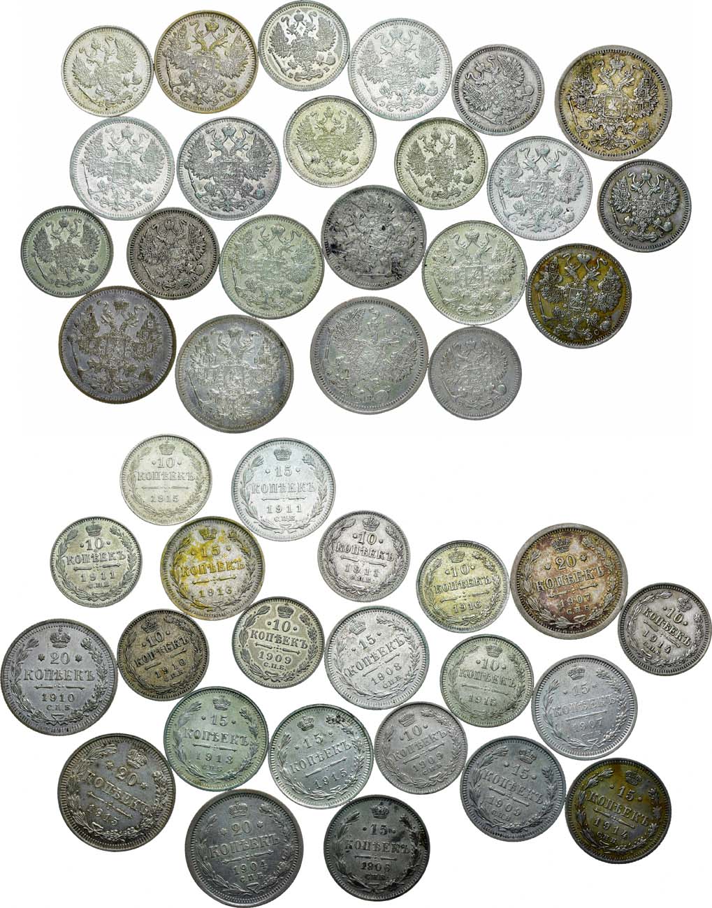 Серебро. 20 копеек 1904 года. СПБ-АР. 3,55 г. XF. 20 копеек 1907 года. СПБ-ЭБ. 3,68 г. XF/AU. 20 копеек 1910 года. СПБ-ЭБ. 3,53 г. AU/UNC. 20 копеек 1915 года. ВС. 3,59 г. UNC. 15 копеек 1906 года. СПБ-ЭБ. 2,69 г. XF. 15 копеек 1907 года. СПБ-ЭБ. 2,58 г. AU. 15 копеек 1908 года. СПБ-ЭБ. 2,65 г. AU. 15 копеек 1909 года. СПБ-ЭБ. 2,68 г. AU. 15 копеек 1911 года. СПБ-ЭБ. 2,68 г. AU. 15 копеек 1913 года. СПБ-ВС. 2,71 г. AU. 15 копеек 1914 года. СПБ-ВС. 2,70 г. XF/AU. 15 копеек 1915 года. ВС. 2,92 г. UNC. 15 копеек 1916 года. ВС. 2,54 г. AU. 10 копеек 1909 года. СПБ-ЭБ. 1,69 г. XF/AU. 10 копеек 1909 года. СПБ-ЭБ. 1,77 г. XF/AU. 10 копеек 1910 года. СПБ-ЭБ. 1,65 г. XF-. 10 копеек 1911 года. СПБ-ЭБ. 1,78 г. XF/AU. 10 копеек 1909 года. СПБ-ЭБ. 1,78 г. UNC. 10 копеек 1914 года. СПБ-ВС. 1,82 г. XF/AU. 10 копеек 1915 года. ВС. 1,77 г. AU/UNC. 10 копеек 1915 года. ВС. 1,76 г. UNC. 10 копеек 1916 года. ВС. 1,80 г. UNC. XF/UNC.