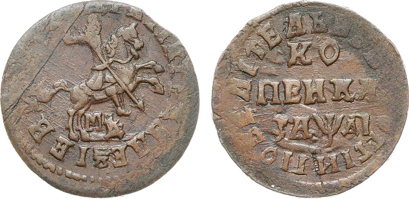 Медь. 7,83г. Кадашевский монетный двор. Аверс: буквы обозначения монетного двора "МД" крупные набиты поверх мелких. Уздеников 2349. Биткин подобна 3511. Дьяков 133, 3651(R0). AU.