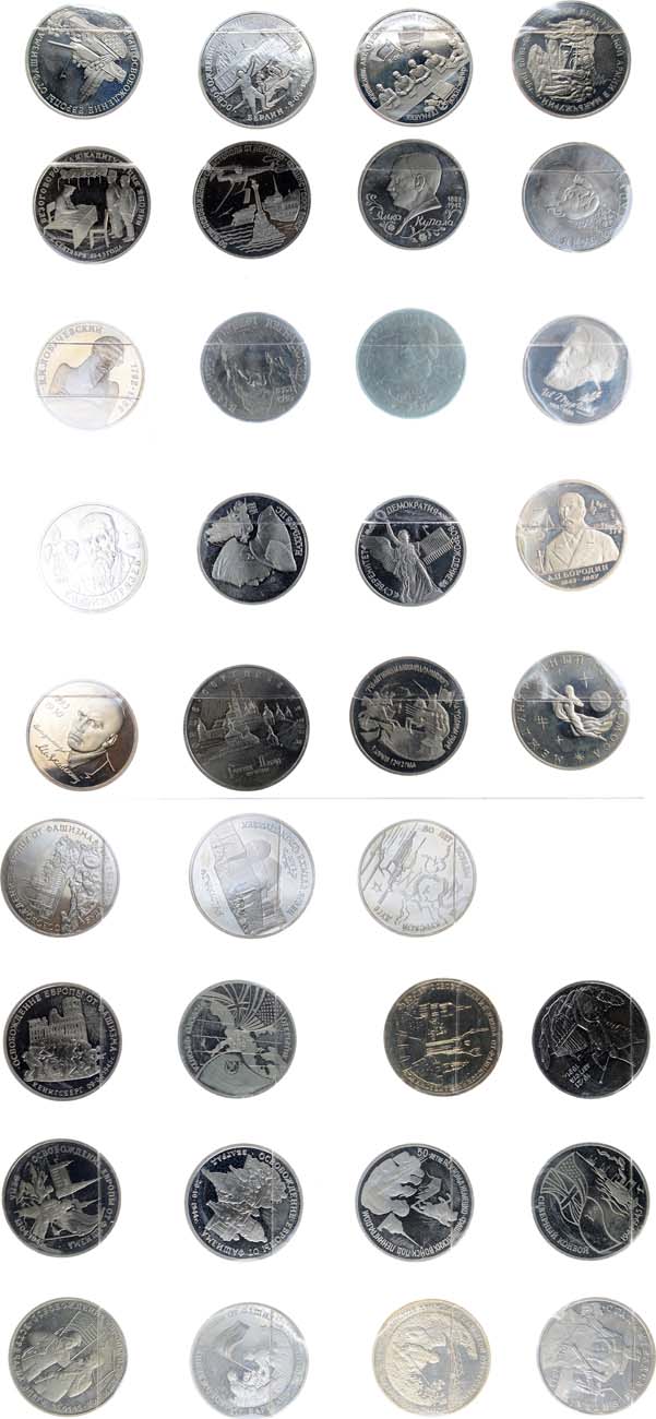 Медно-никелевый сплав. 1 рубль 1992 Купала, Колас, Нахимов, демократия; 1 рубль 1992 Лобачевский; 1 рубль 1993 Лобачевский, Державин, Тургенев, Тимирязев, Бородин, Маяковский; 3 рубля 1992 свобода, северный конвой, Невский, год космоса; 3 рубля 1993 Сталинградская битва, Курская дуга, освобождение Киева; 3 рубля 1994 разгром под Ленинградом, партизаны, второй фронт, Белград, освобождение Севастополя; 3 рубля 1995 Варшава, Будапешт, Кенигсберг, Вена, встреча на Эльбе, Прага, Берлин, капитуляция Германии, разгром в Маньчжурии, капитуляция Японии; 5 рублей 1992 мавзолей Ясави; 5 рублей 1993 Троице-Сергиева лавра. PROOF.