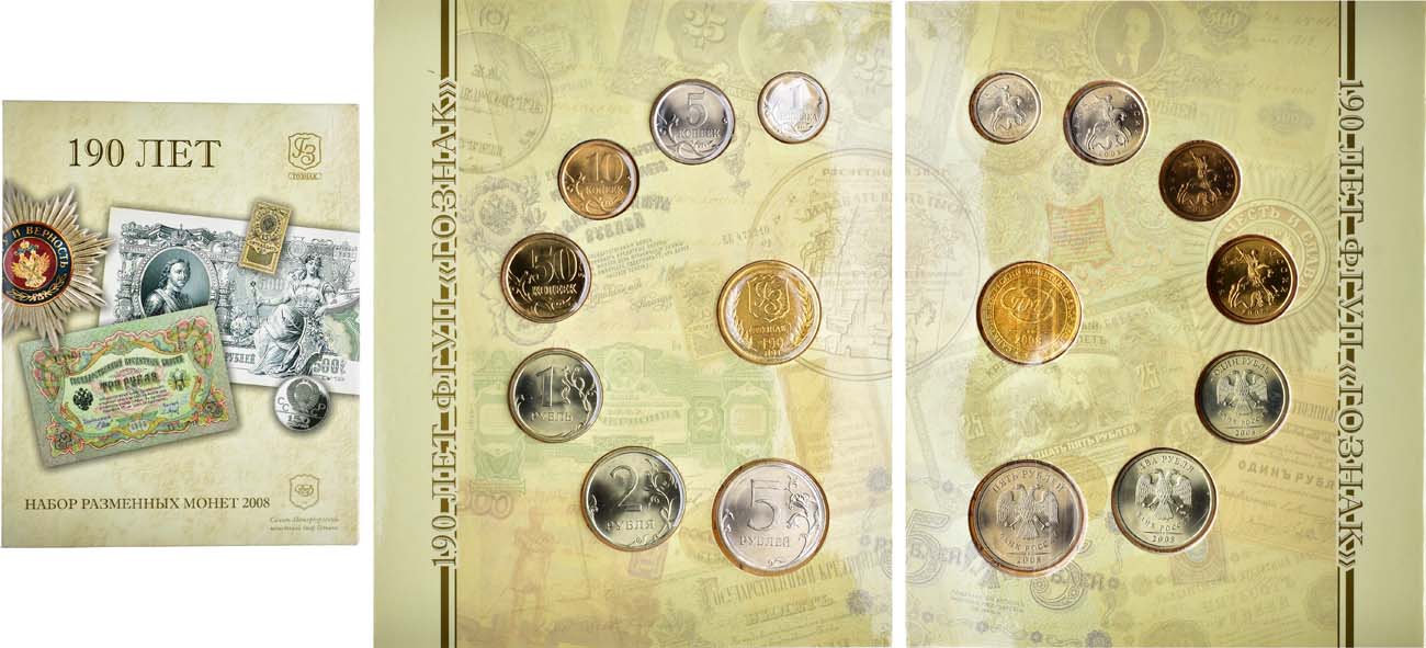 В состав набора входят: Жетон 2008 года. СПМД. 190 лет ГОЗНАКУ. 1 копейка 2008 года. СПМД. Мельхиор-сталь-мельхиор. 5 копеек 2008 года. СПМД. Мельхиор-сталь-мельхиор. 10 копейка 2008 года. СПМД. Томпак-сталь-томпак. 50 копейка 2008 года. СПМД. Томпак-сталь-томпак. 1 рублей 2008 года. СПМД. Медно-никелевый сплав. 2 рубля 2008 года. СПМД. Медно-никелевый сплав. 5 рублей 2008 года. СПМД. Мельхиор-медь-мельхиор. BU.