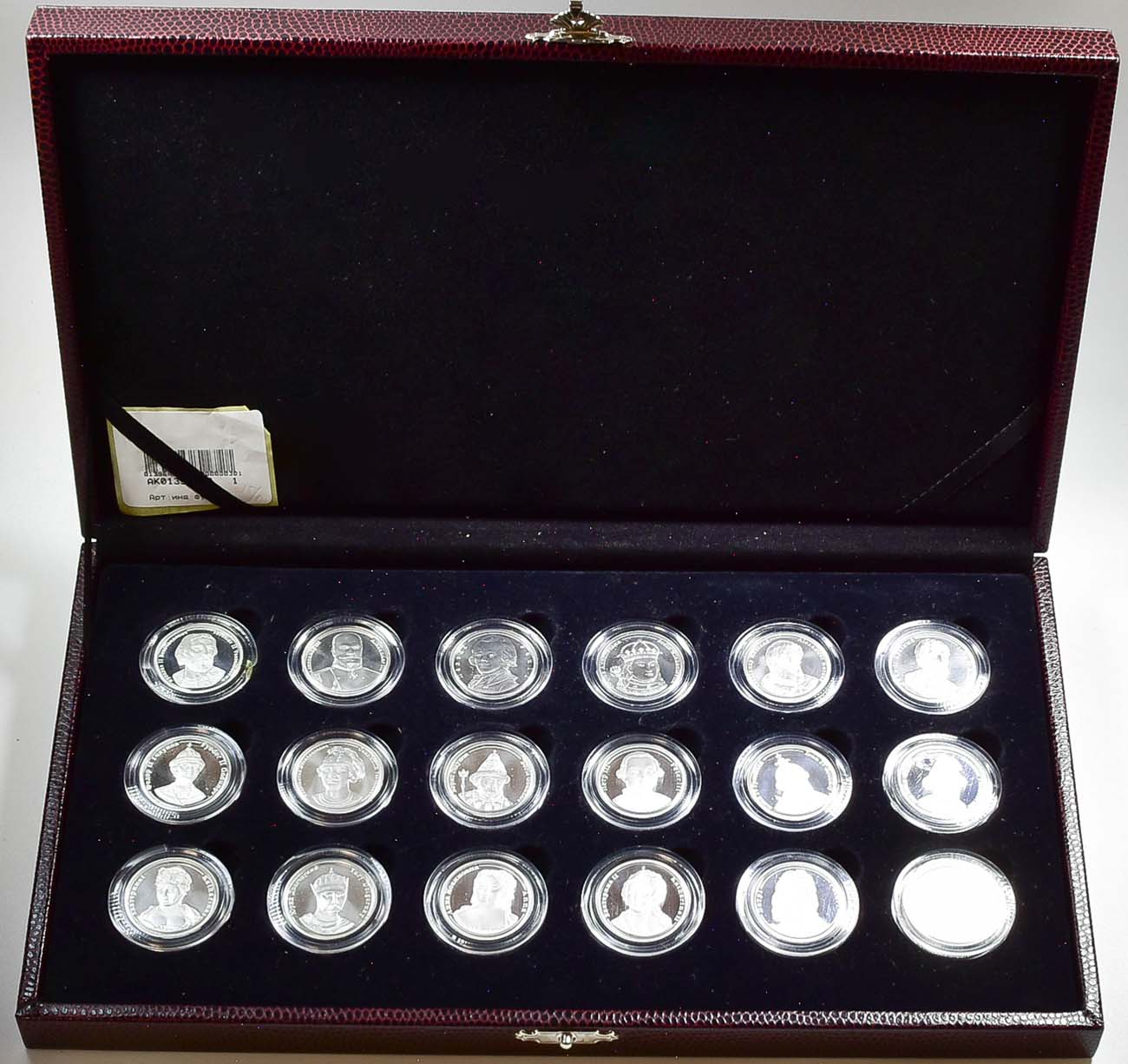 Серебро 925 проба. Диаметр каждой медали 23 мм. Вес каждой медали примерно 6,4 г. Санкт-Петербургский монетный двор. В наборе 18 медалей. PROOF.