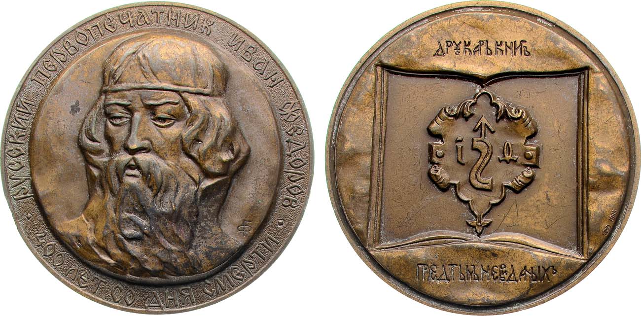 Существуют экземпляры с обозначением года выпуска - "1984" на поле медали. Иван Фёдоров (около 1510/1530-1583 гг.) - один из первых русских книгопечатников, издатель первой точно датированной печатной книги "Апостол" в Русском царстве, а также основатель Острожской типографии в Русском воеводстве Речи Посполитой.