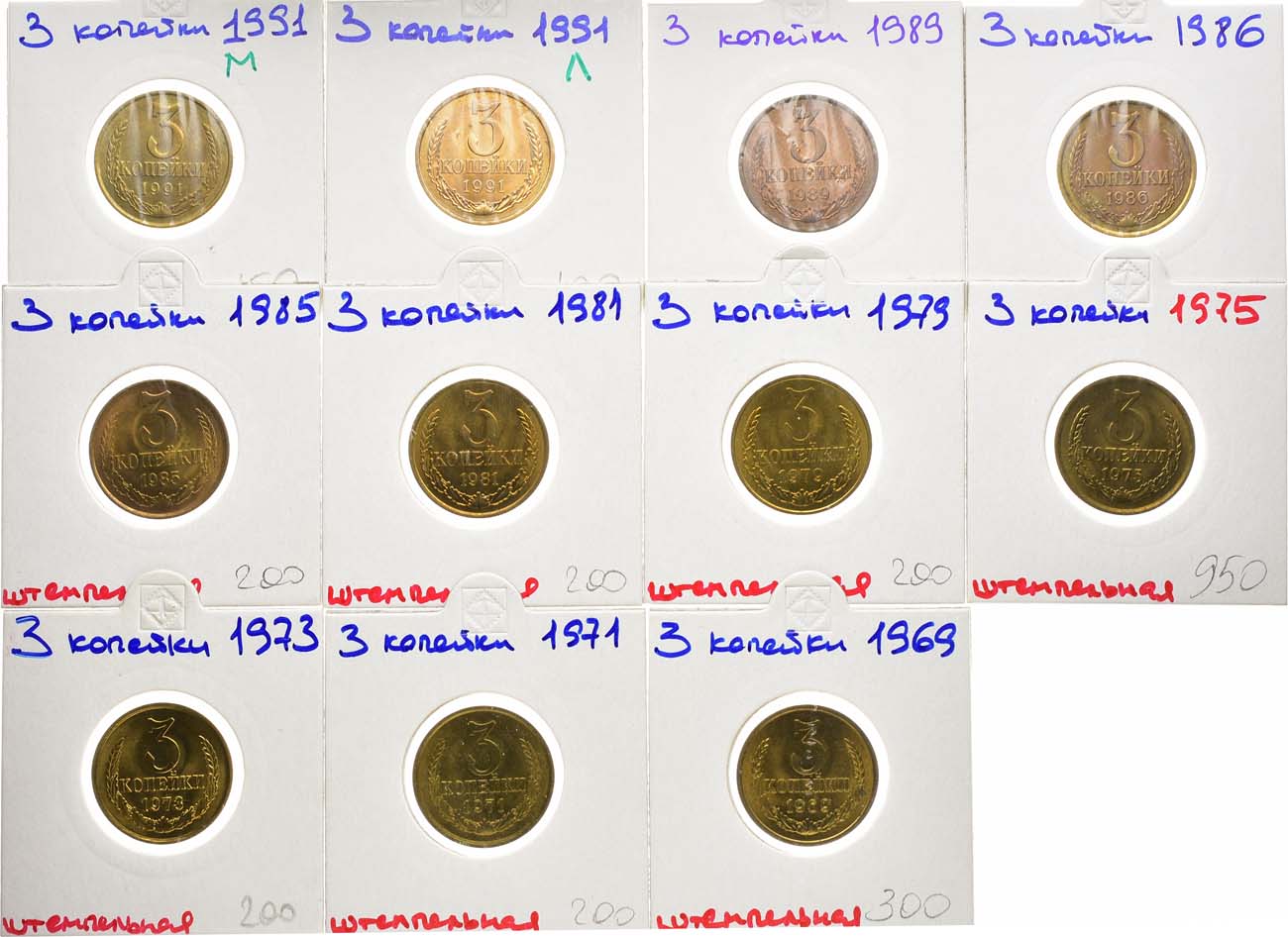 Медно-цинковый сплав. 3 копейки 1969 года. Федорин 153. 3 копейки 1971 года. Федорин 155. 3 копейки 1973 года. Федорин 162. 3 копейки 1975 года. Федорин 165. 3 копейки 1979 года. 3 копейки 1981 года. 3 копейки 1985 года. Федорин 202. 3 копейки 1986 года. Федорин 206. AU. 3 копейки 1989 года. ММД. Федорин 217. 3 копейки 1991 года. ЛМД. Федорин 223. 3 копейки 1991 года. ММД. Федорин 224. AU/UNC.
